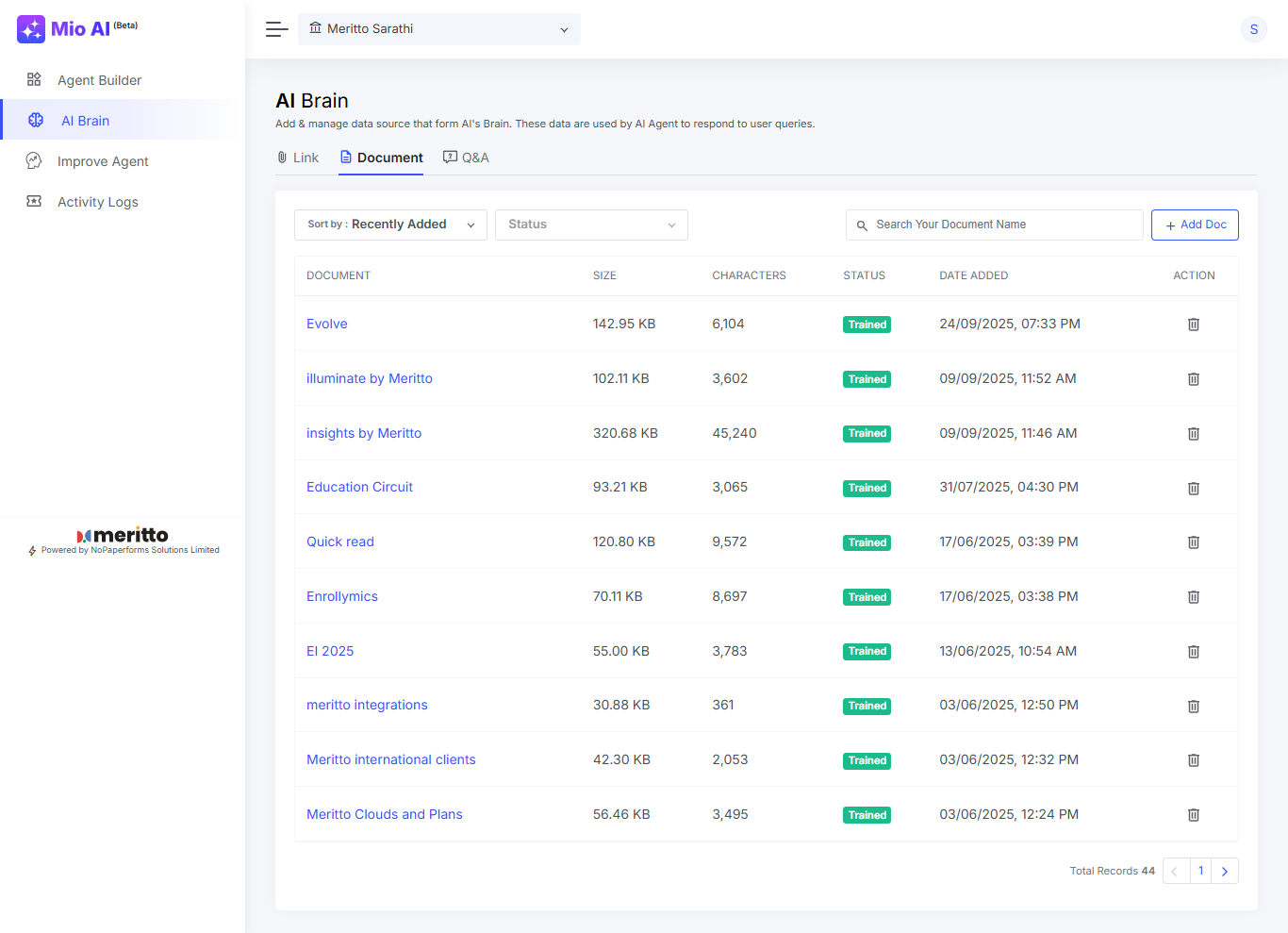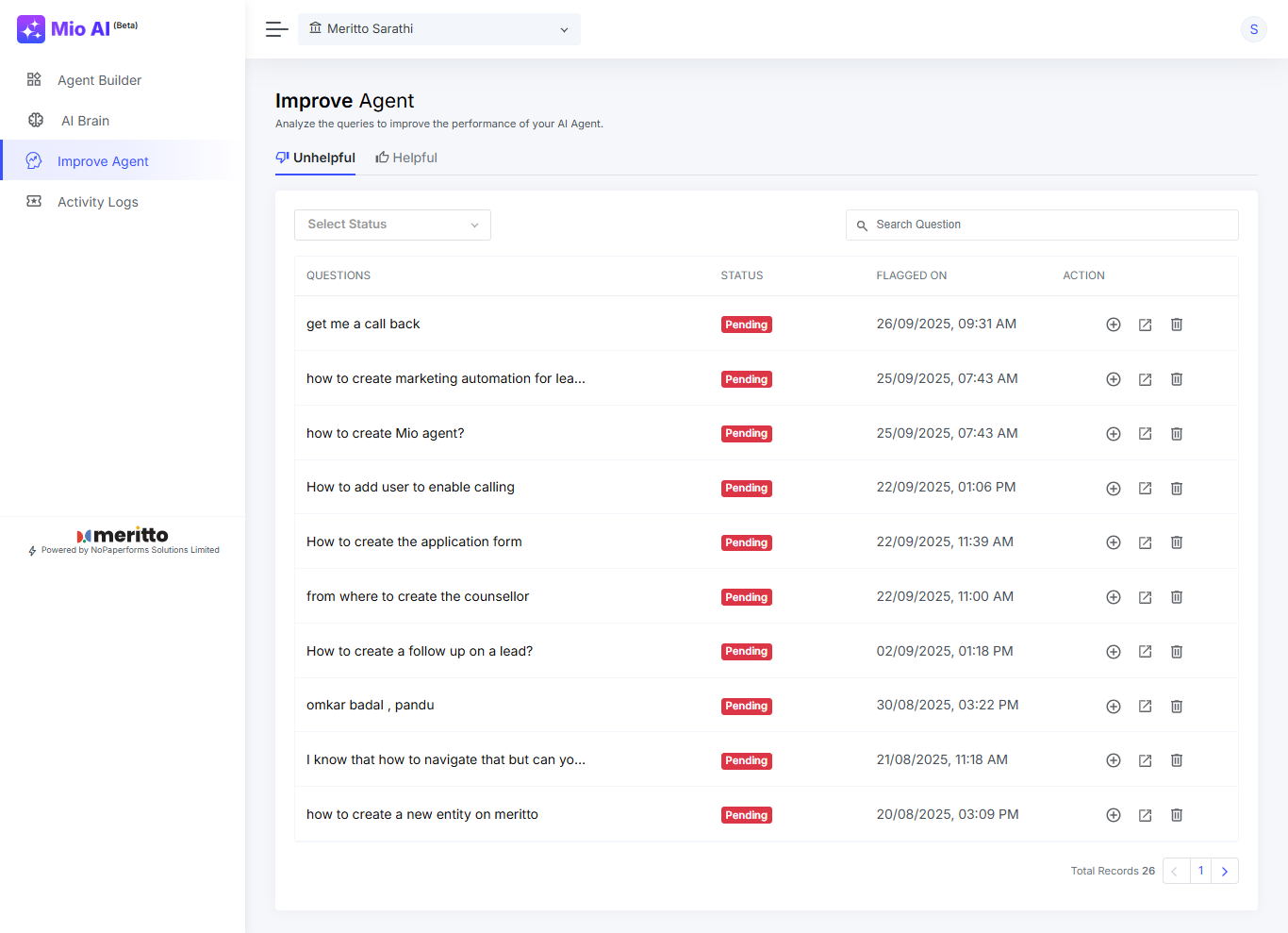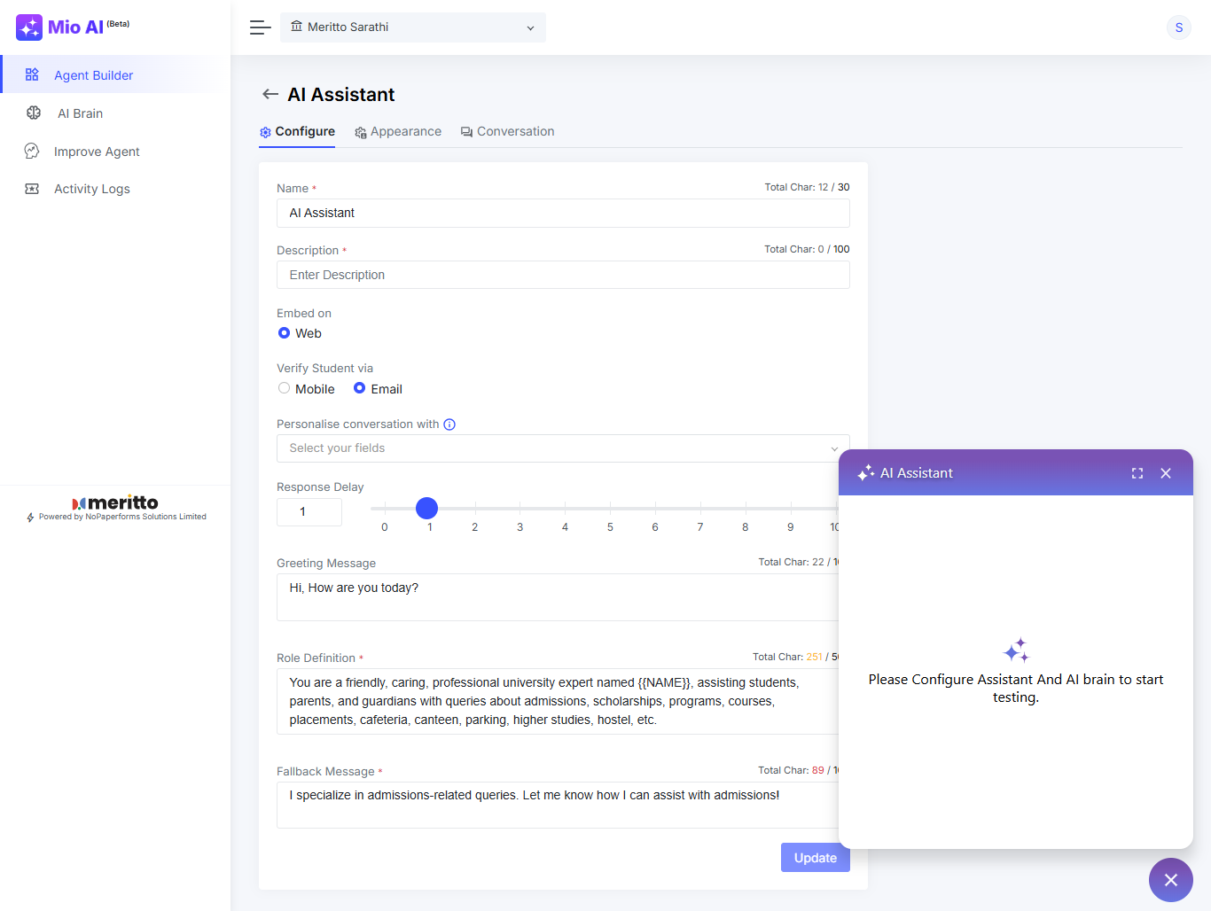 - Dynamic Knowledge and Continuous Learning: Traditional chatbots rely on a static, manually updated database of questions and answers. Mio’s "AI Brain" is a dynamic knowledge hub that learns directly from an institution's live data- its websites, its policy documents, and its brochures. Furthermore, through features like "Improve Agent," it continuously learns from user feedback, becoming smarter and more accurate with every interaction.
