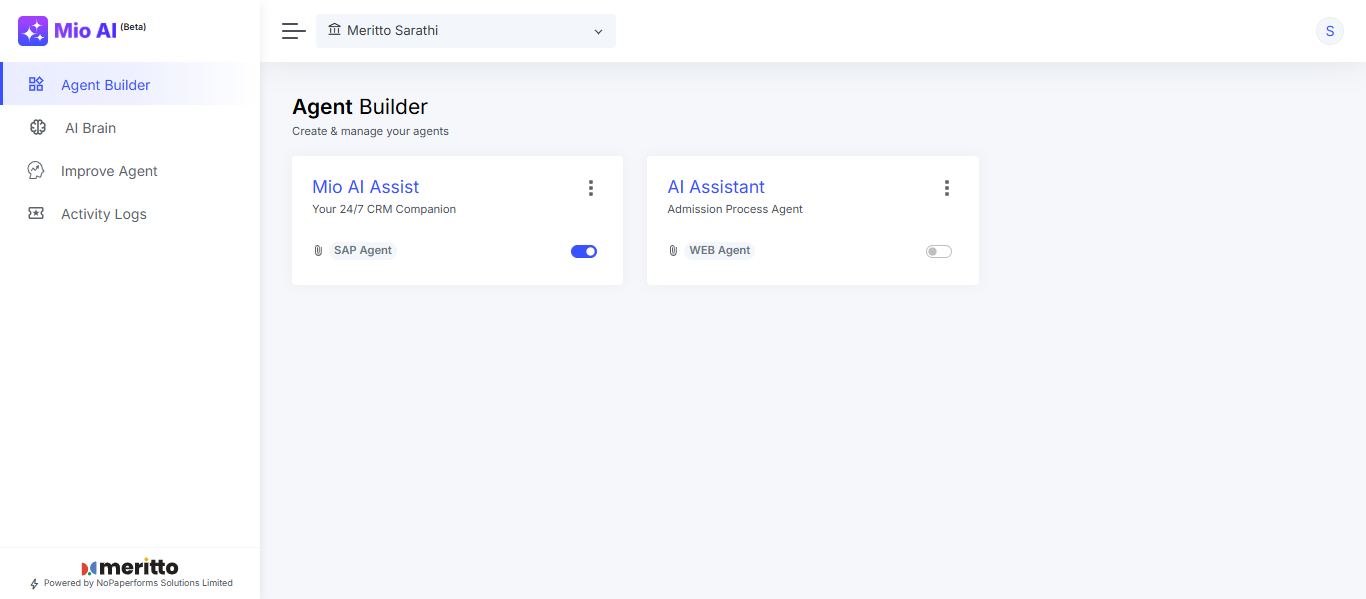 As shown in the screenshot below, there are two Agents - SAP and Web. The SAP Agent is by default present in the Applicant Dashboard when the applicant logs into the SAP. The Web agent can be deployed across multiple websites/webpages, which will allow the lead to interact with Mio Ai Agent.