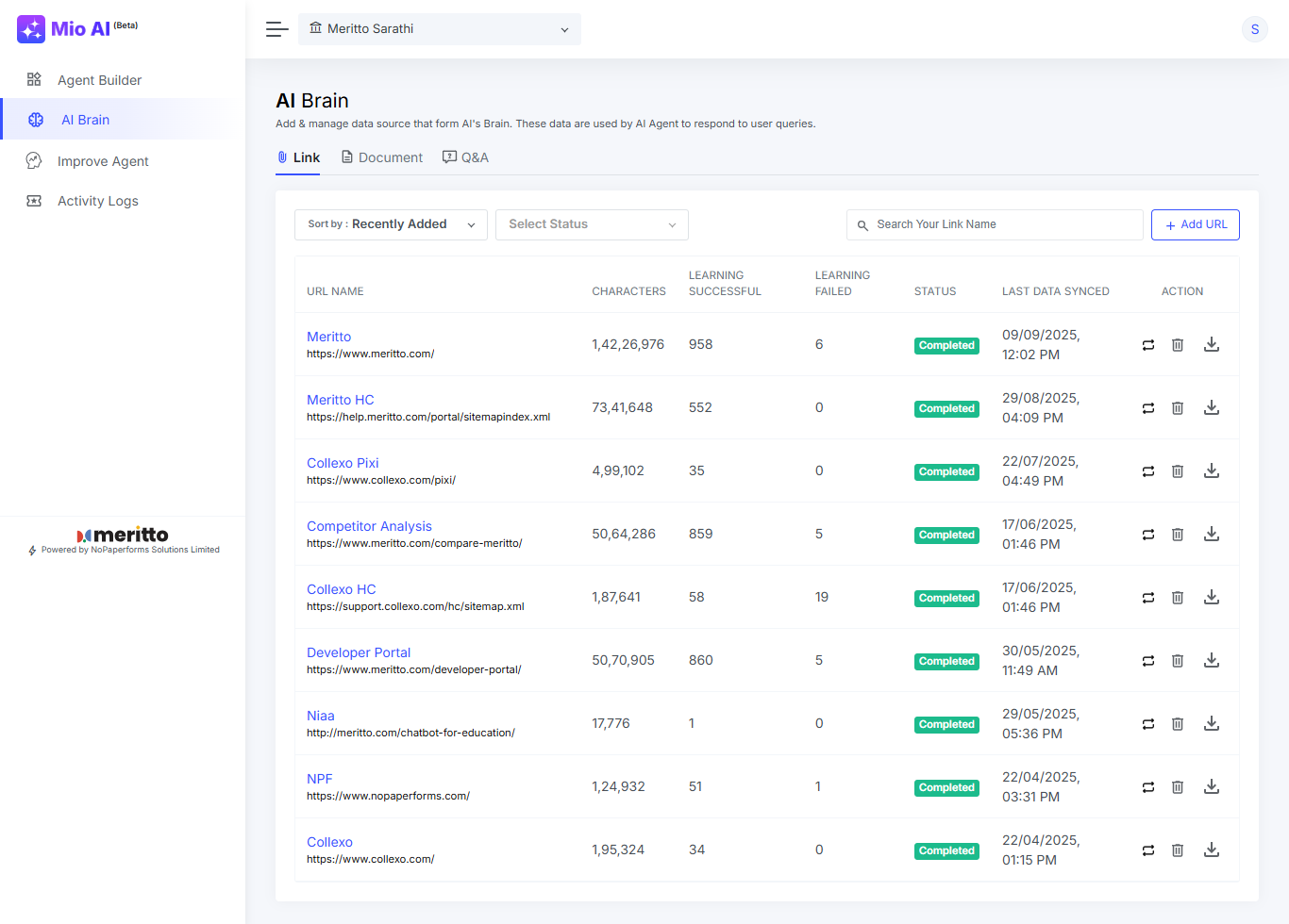 - Status: This shows the current state. "Completed" means the AI has successfully finished learning from that link.