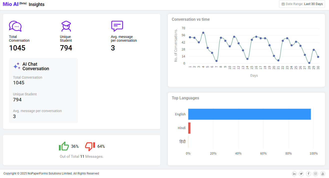- Avg. message per conversation: This metric shows the average length of a conversation, giving you an idea of how engaged students are.