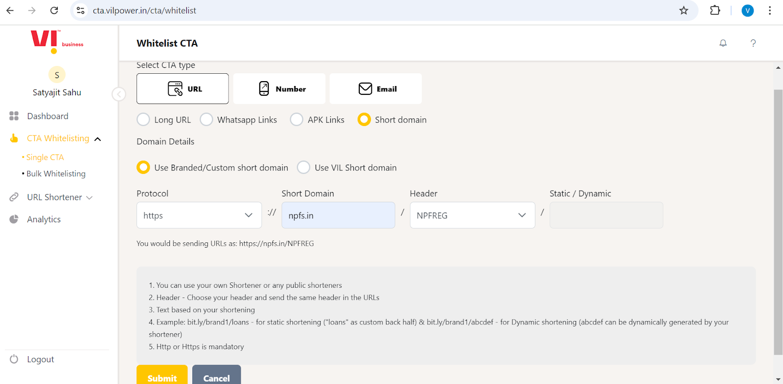 CTA (Call-to-Action) whitelisting refers to registering and getting approval for shortened URLs used in SMS templates. This ensures: