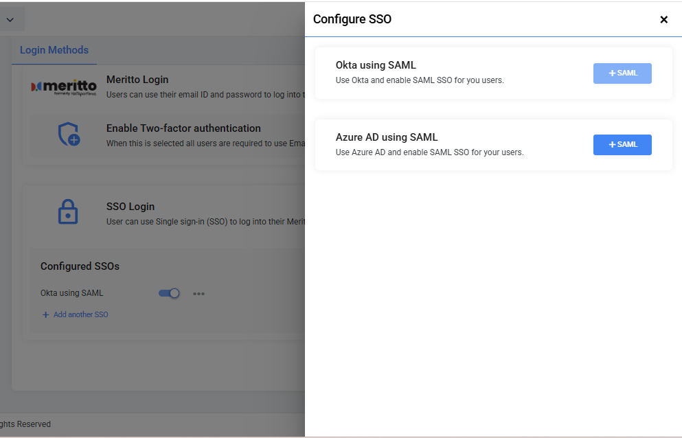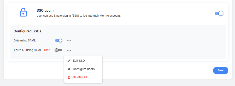 Meritto enables identity providers (IdPs) to verify user identities, ensuring a seamless and secure authentication process. The users can utilise their existing login credentials managed by IdPs such as Okta and Azure AD. This eliminates the need for users to remember multiple passwords, making the login process more seamless and efficient.