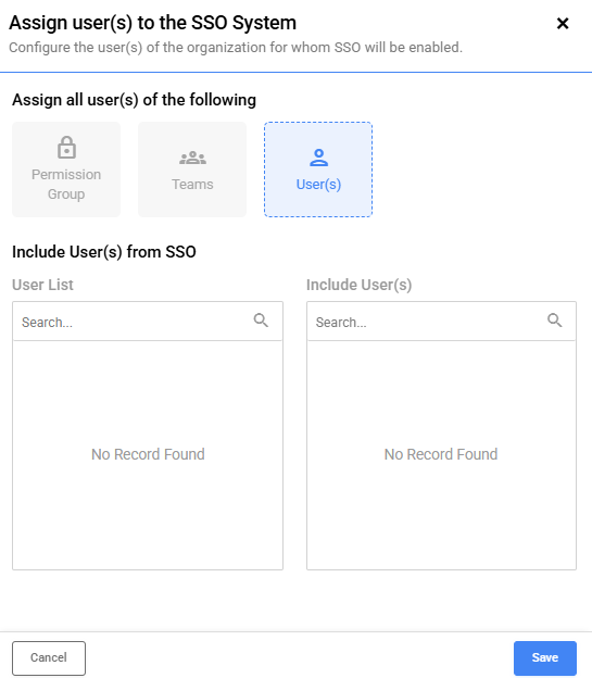 3. Assign SSO to Teams: Under this criteria, users can be searched based on their assigned user groups. Simply select the "Users" radio button and choose the appropriate user group under "Select User Group(s)." Below this, you will find two search boxes labeled "User List" and "Included Users." These options allow you to include specific users from the selected user group while assigning users from that group.