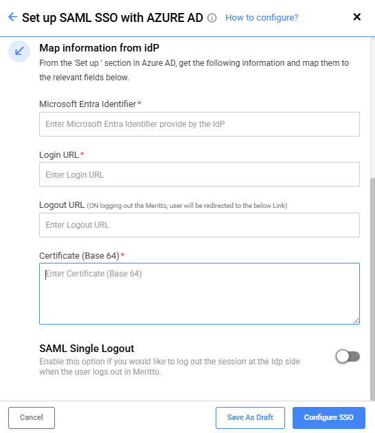 1. Once you have filled in all the relevant fields while configuring SSO, clicking on the [Cancel] CTA should save all the entered details as a draft.