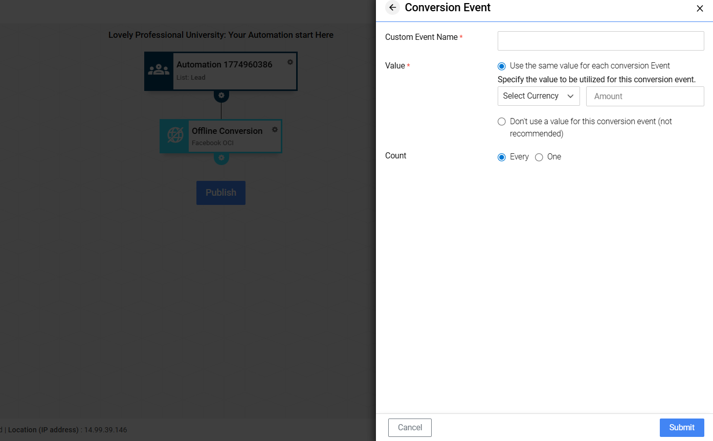 Use different value for each conversion | When value differs per lead (recommended for payments). Enter a default value if value against lead is not available, then this amount will be sent for that lead conversion. Once you create the action, you will get an option to map the field whose values you want to push in that conversion. |
