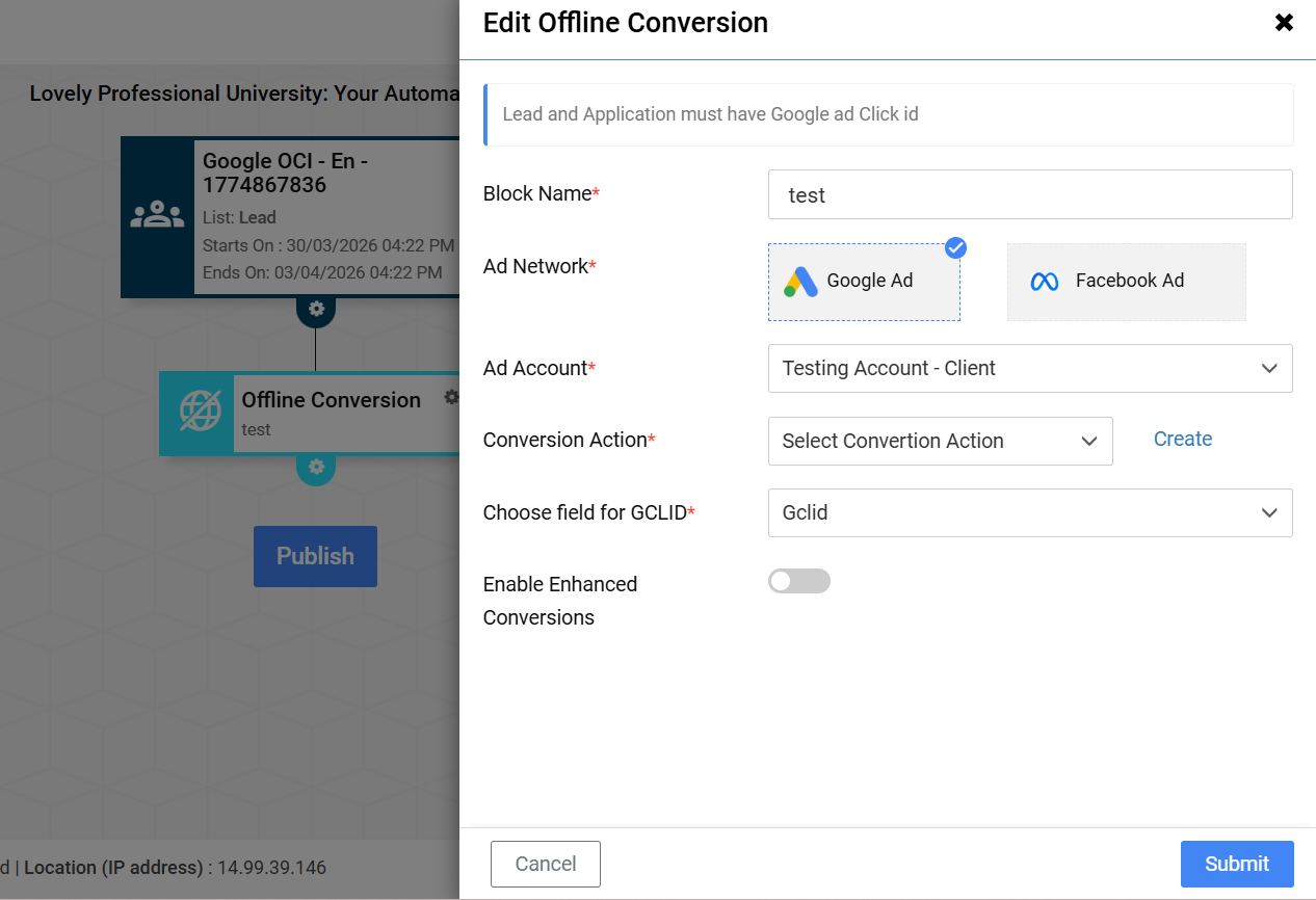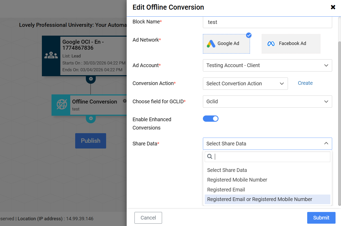 To solve this, Enhanced Conversions for Leads has been introduced in Meritto. This feature allows you to send secure, privacy-safe customer data (email and/or mobile number) to Google Ads, improving conversion tracking accuracy even when GCLID is unavailable.