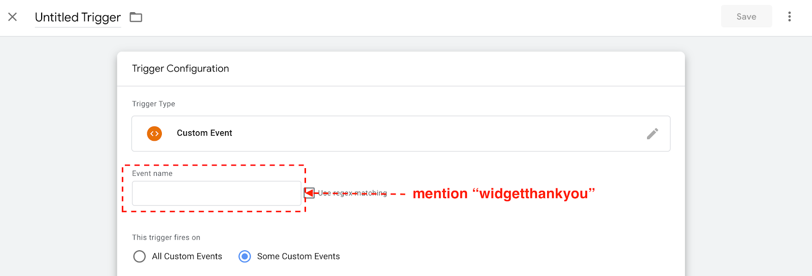 - Add "Tags" and "Triggers" as required. For accessing "the widgetthankyou" event, please select "Trigger" Type as "Custom Event".