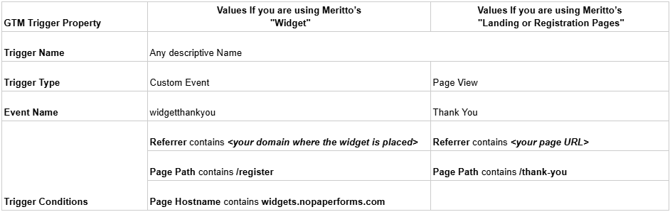 By following these steps, you can successfully identify and configure triggers for Meritto assets in Google Tag Manager. Ensuring that the correct AJAX Listener is installed and using the "widgetthankyou" event helps in capturing user interactions accurately. Always validate your tags and triggers through GTM’s Preview mode before finalizing the setup.