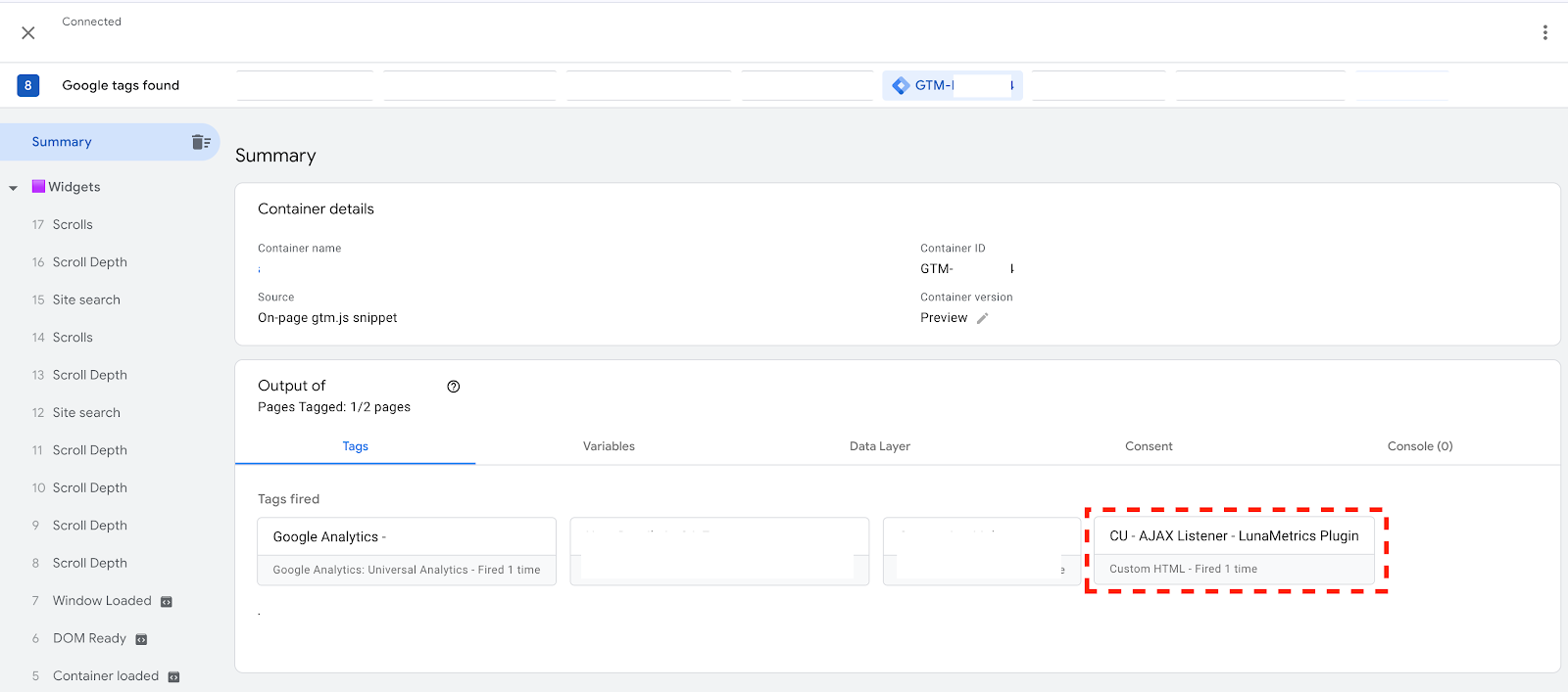 - A Google Tag Assistant Window will open up, which might look like the screenshot below. Find "Widgets Event" and ensure the "CU - AJAX Listener - LunaMetrics Plugin" tag is fired. This confirms you have added the "AJAXListener" correctly: