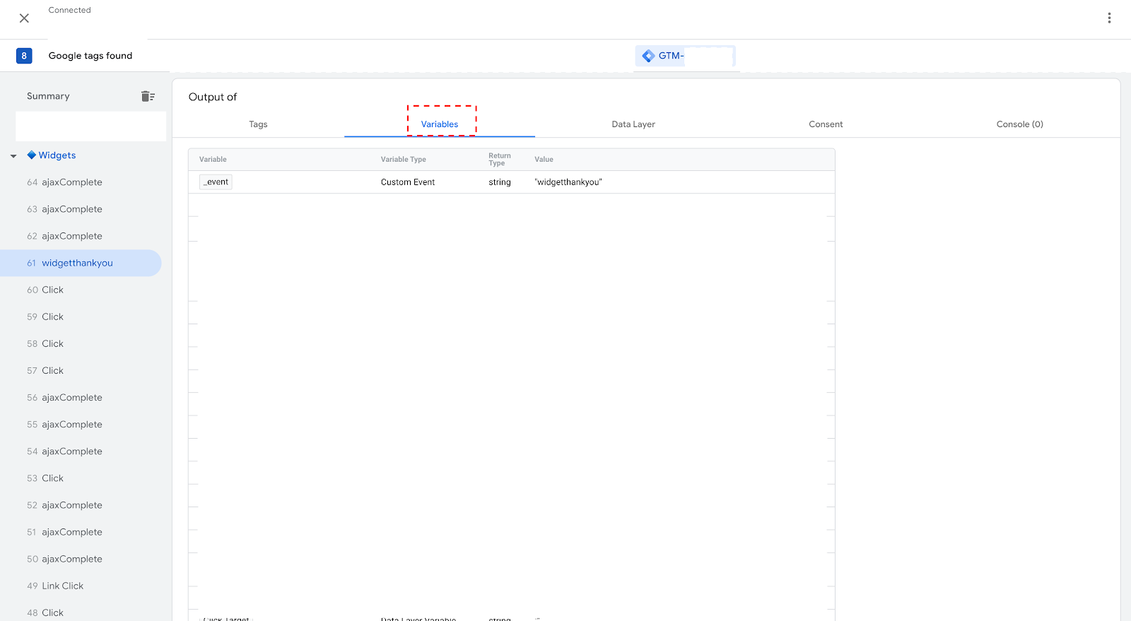 - Now switch back to the "Google Tag Assistant Window". You need to find and click on "widgetthankyou" event under "Widgets" shown below: