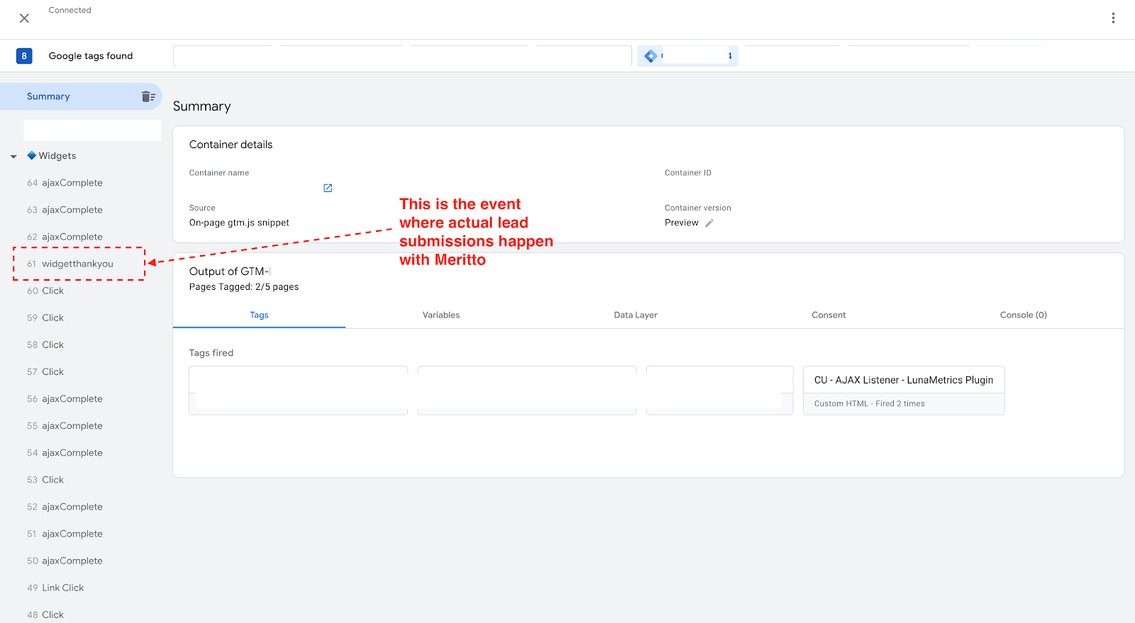 This article guides you through the process of identifying and configuring triggers for Meritto assets using Google Tag Manager (GTM). It includes steps for verifying the AJAX Listener setup, using Preview Mode to track widget events like form submissions, and setting up custom triggers for accurate conversion tracking.