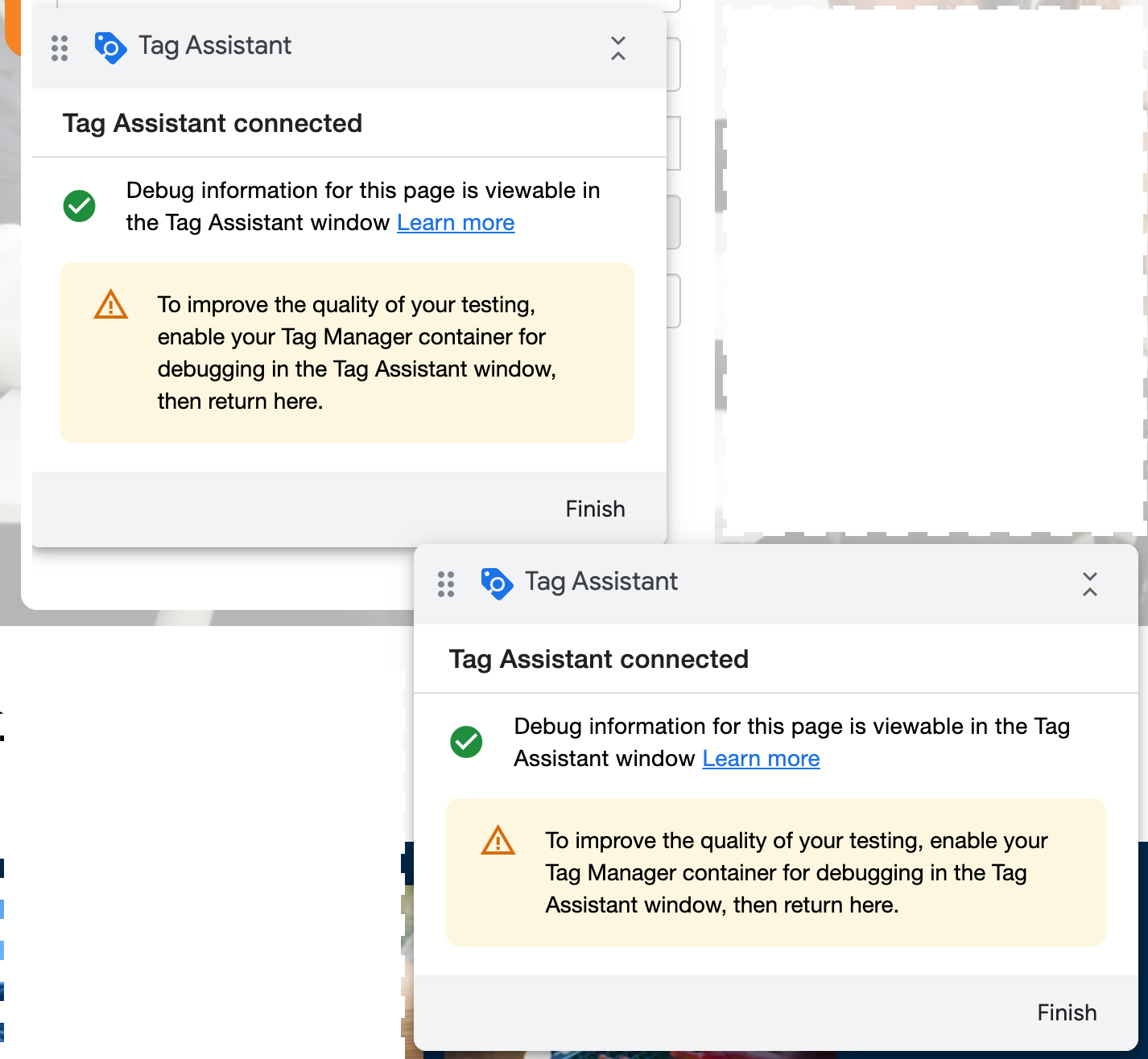 - An additional window of your entered URL (https://<yourURL>/?gtm_debug=xxxxxxxxxx) will open. This is your Debugging Window. Please wait and ensure 2 "Tag Assistant Pop-ups like the one shown below" are loaded - one in your overall page and another one in the "Widget". (⚠This may sometimes not appear due to lag or issues at "Google Tag Manager" app. In this case, try with another user, window, or device. In case, none of them work out, please reach out to "Google Support"):