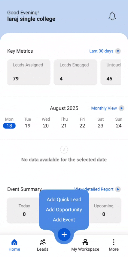 - Lead Profile: In the Bottom Navigation Bar, click on Leads. On the Leads Page tap on a Lead Tuple. Tap the + icon on the bottom right corner in the profile and select Add Event.