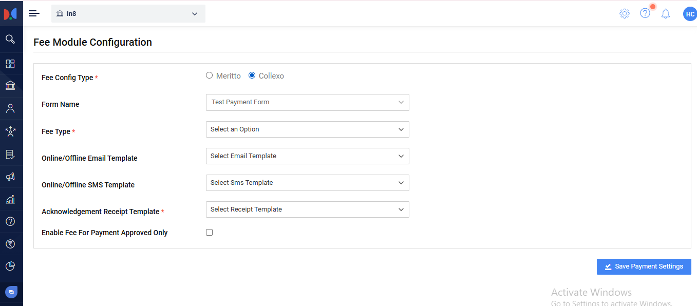 - Configure the Fee Structure - Now once the above is done, set up the payment details within Meritto and Collexo. In order to do so you need to navigate to “Fee Manager” and click on “Configure Fees”. Select Collexo in the configuration and fill up the other relevant fields.