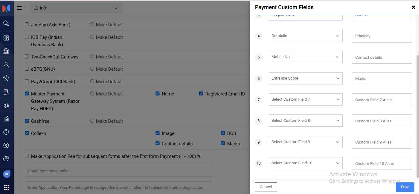 A sidebar titled “Payment Custom Fields” will appear, displaying a dropdown menu containing all custom fields mapped with a machine key. Select the desired fields that need to be sent to Collexo (e.g., Applicant Name, ID). For each selected field, provide an appropriate field alias name as expected by Collexo. Once done, click Save to apply the configuration.