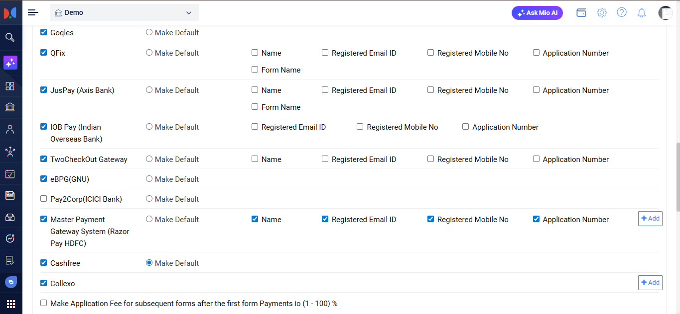 Meritto offer seamless integration with 25 different Payment Gateways (PGs) to facilitate the collection of various types of fees from applicants. In addition to these PG integrations, Meritto also supports integration with Collexo, enabling institutions to collect application fees through Partwise Forms and token fees through all types of forms.