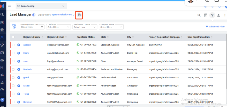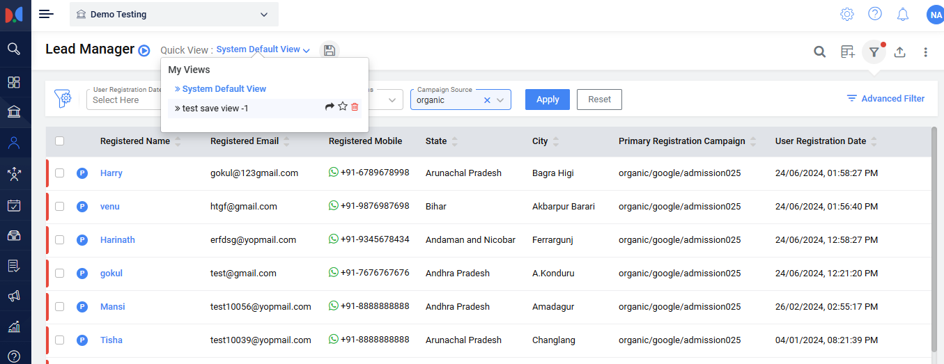 - Save View: Users can save their desired view configurations, including columns and filters, by clicking on the "Save View" icon placed next to Quick View. This helps in quickly accessing the preferred view for daily tasks.