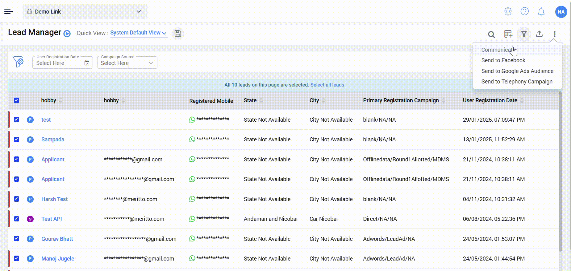 Apply Filters to Select the Leads to whom you wish to send the communication. (Check How to use filters article). Mark the desired leads by clicking the checkbox next to their Registered Name. Click on the
