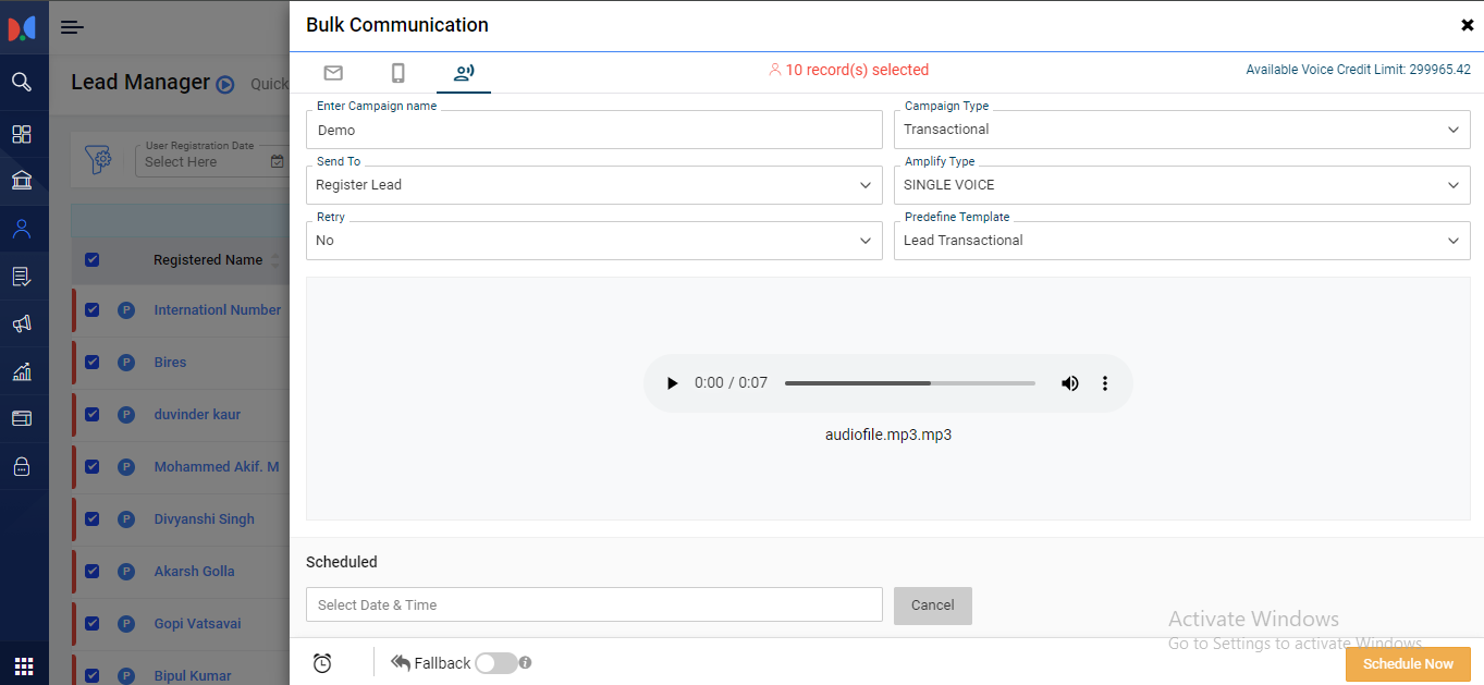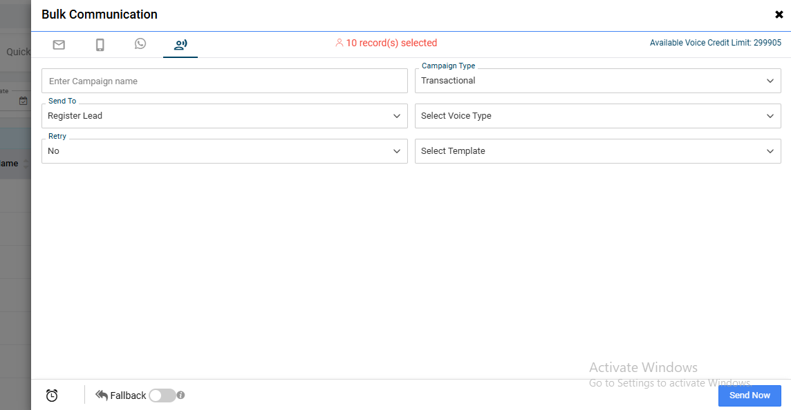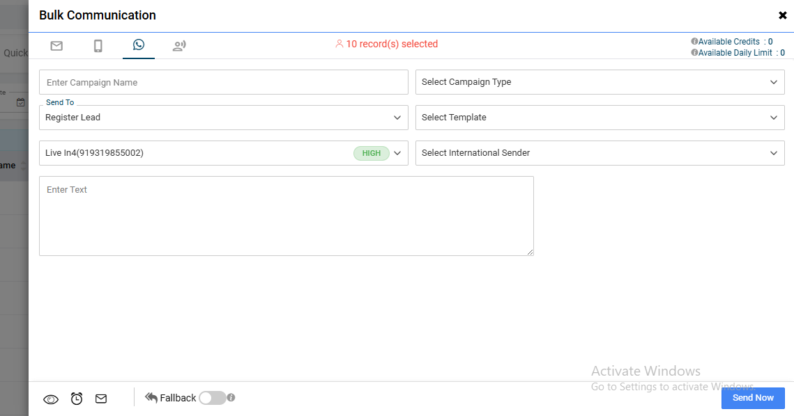 - If in case you want to have a "Fallback" method, then switch on the "Fallback" toggle as ON. With this, for any lead whose Alternate Number isn't available (If in case the Campaign needs to be sent to an Alternate Number), for such leads, the campaign will be sent to their Primary Mobile Number.
