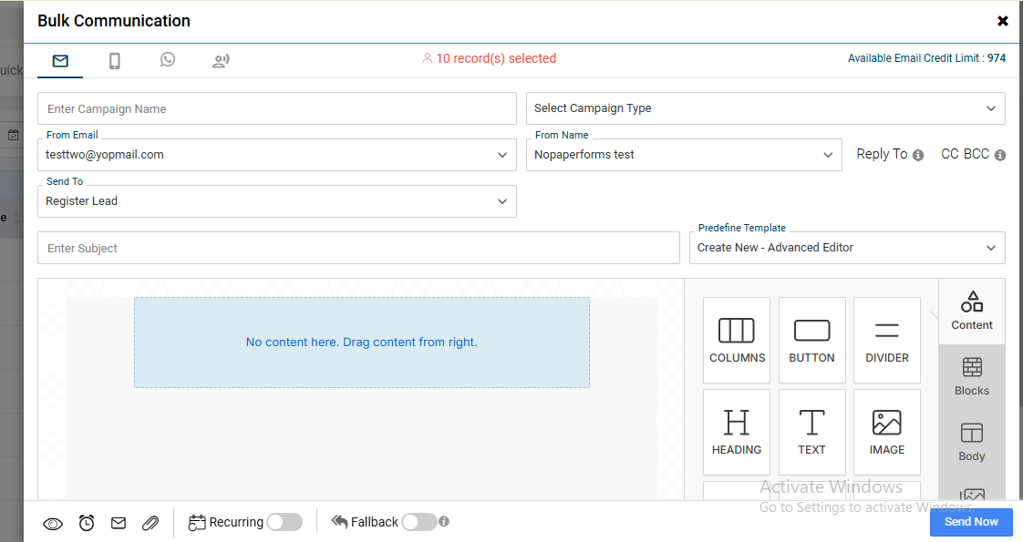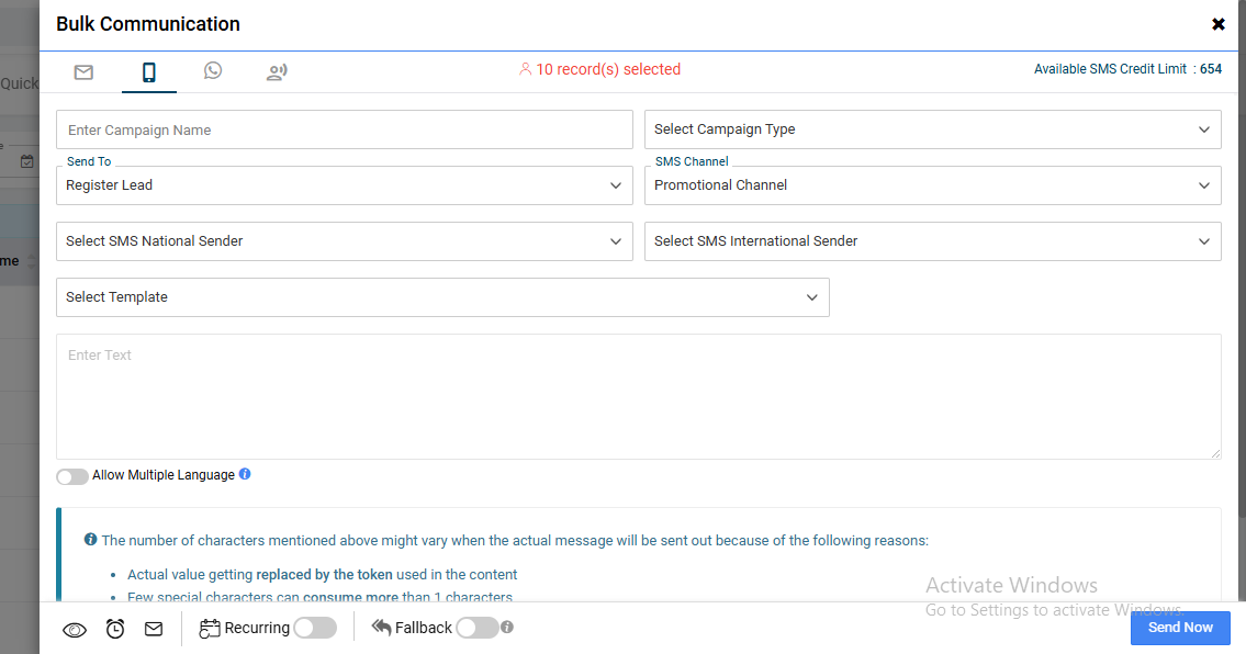 - For Bulk Communication, at least more than one lead needs to be selected.