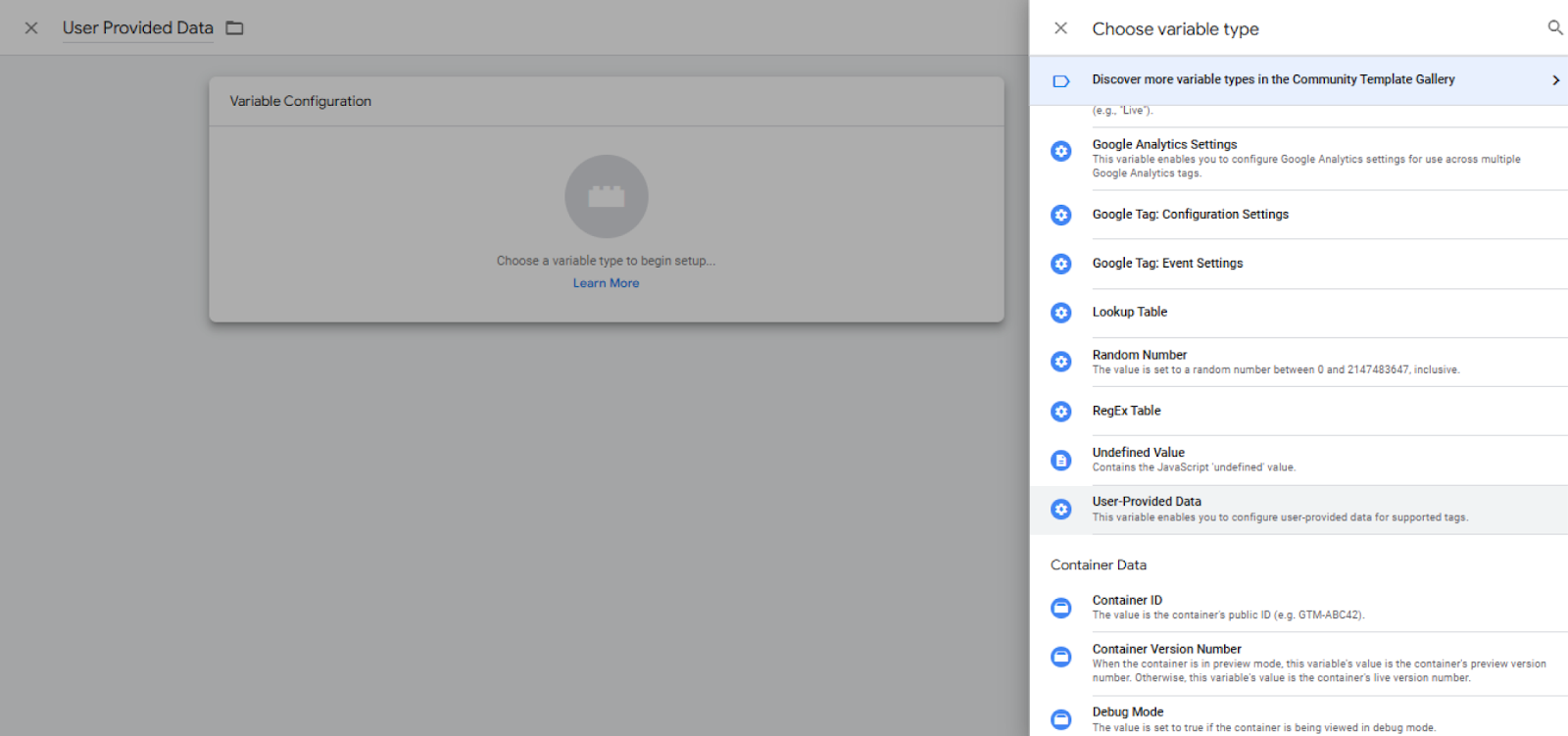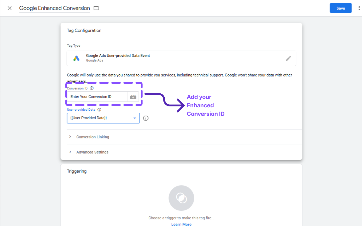 - Add your enhanced conversion ID and select the variable as “User Defined Variable”. If the variable is not available, please create following the steps mentioned in earlier section.