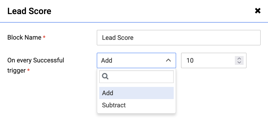 - After adding the Lead score node user would be able to define the block name and can add/subtract the score in the node.