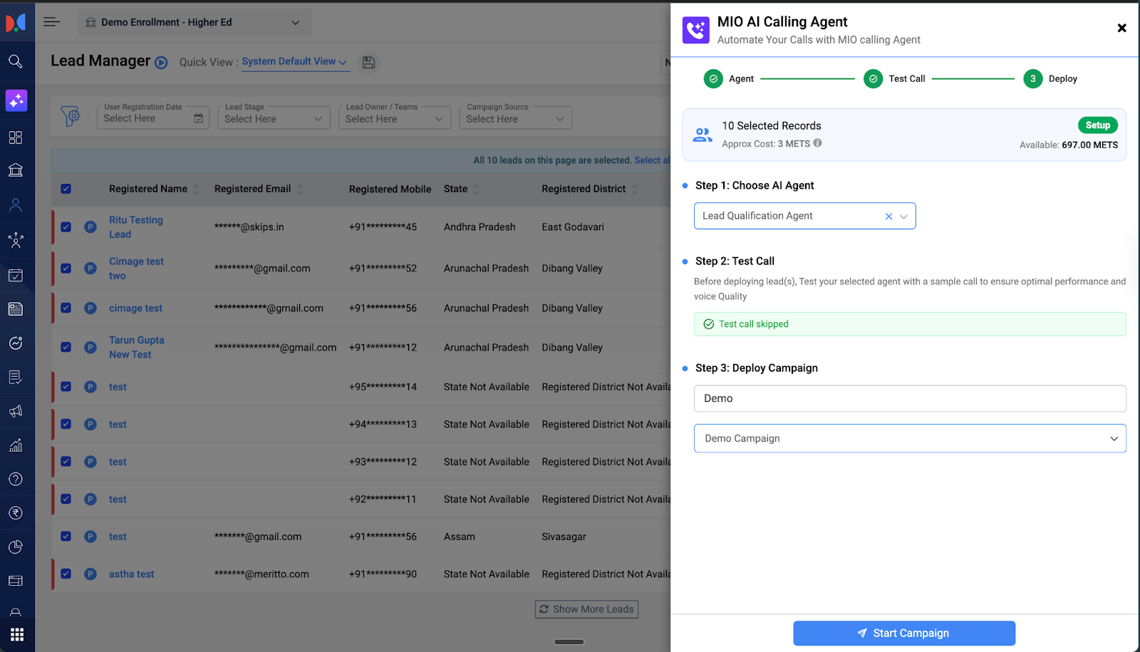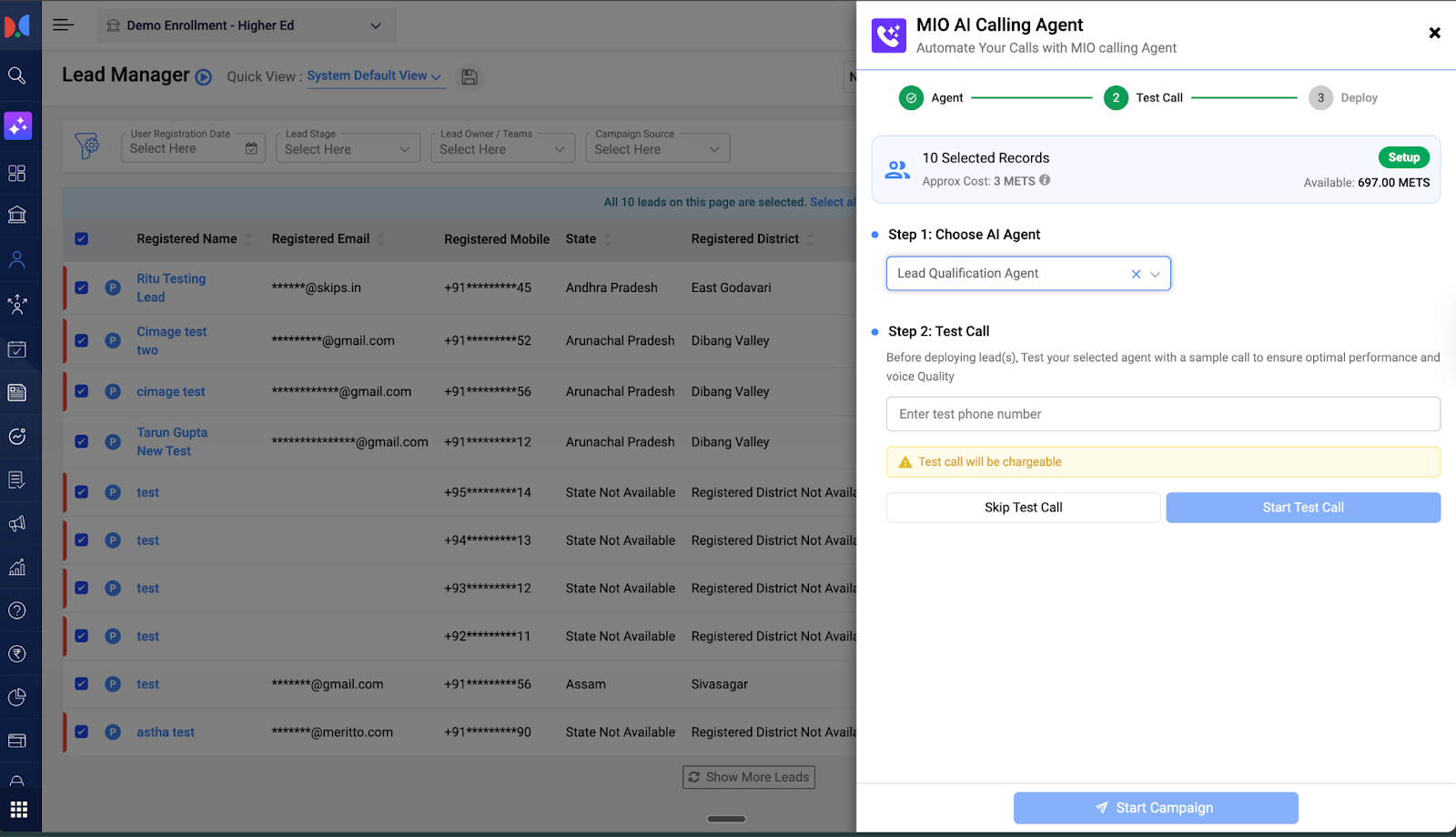 - Next, if you want to make a test call to a single test number before initiating the Bulk Campaign, then you can enter a test number and click on Make a Test Call and test the Agent. Note - Test Call will consume METs. Test Call is an optional step