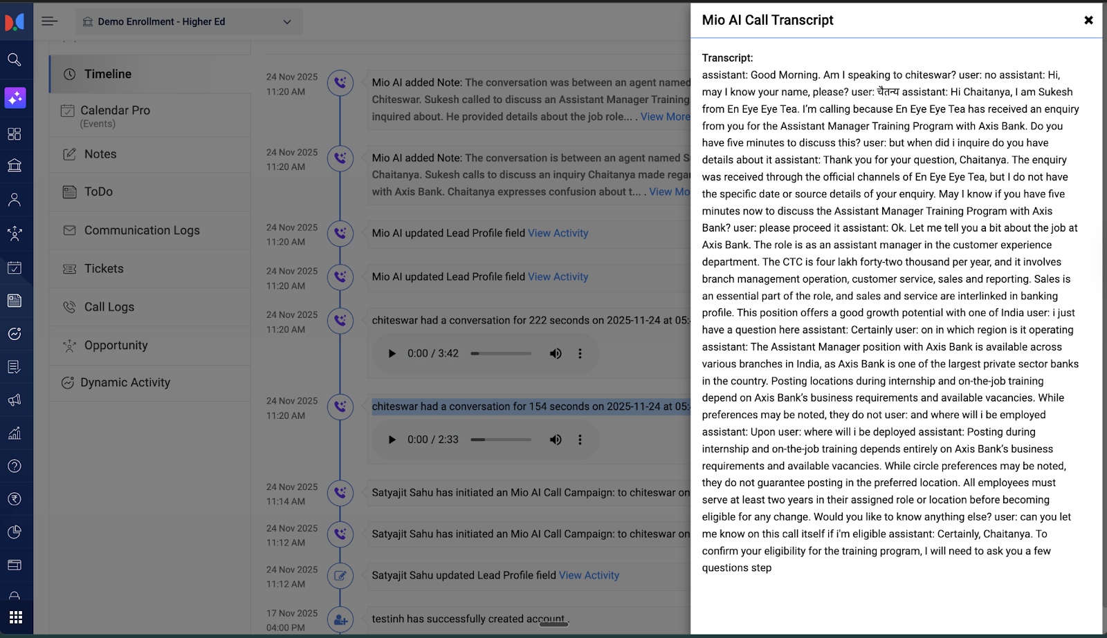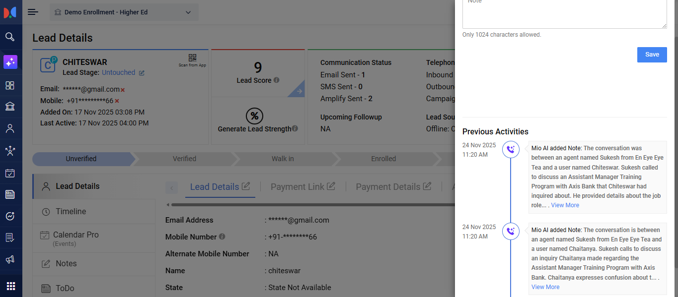- <Counsellor Name> has initiated an Mio AI Call Campaign: to Applicant on ********** at 11-24-2025 11:14:49 AM.