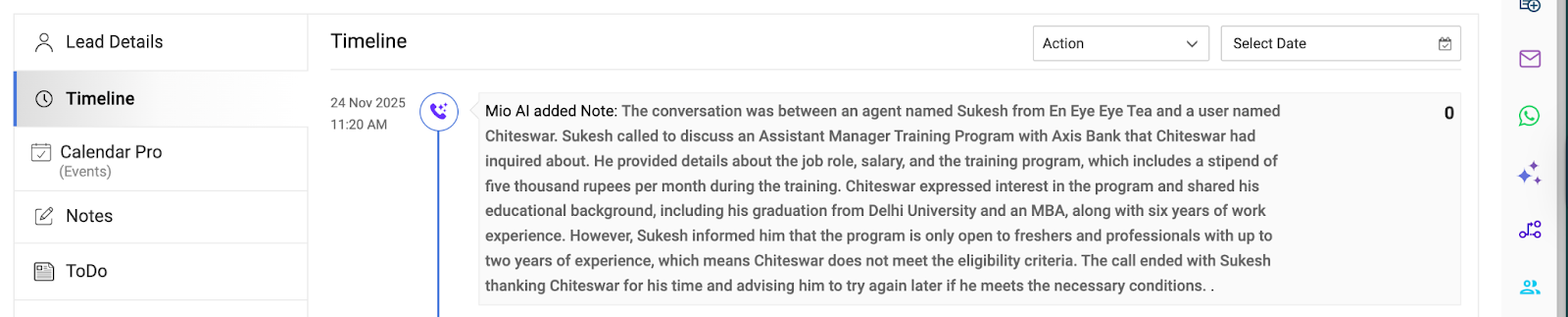 This refers to the Call Summary that was automatically updated as a Note by the Mio Agent in the Meritto CRM.