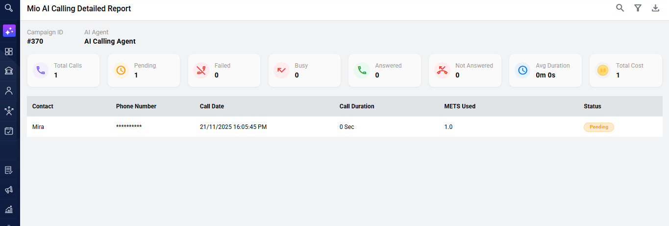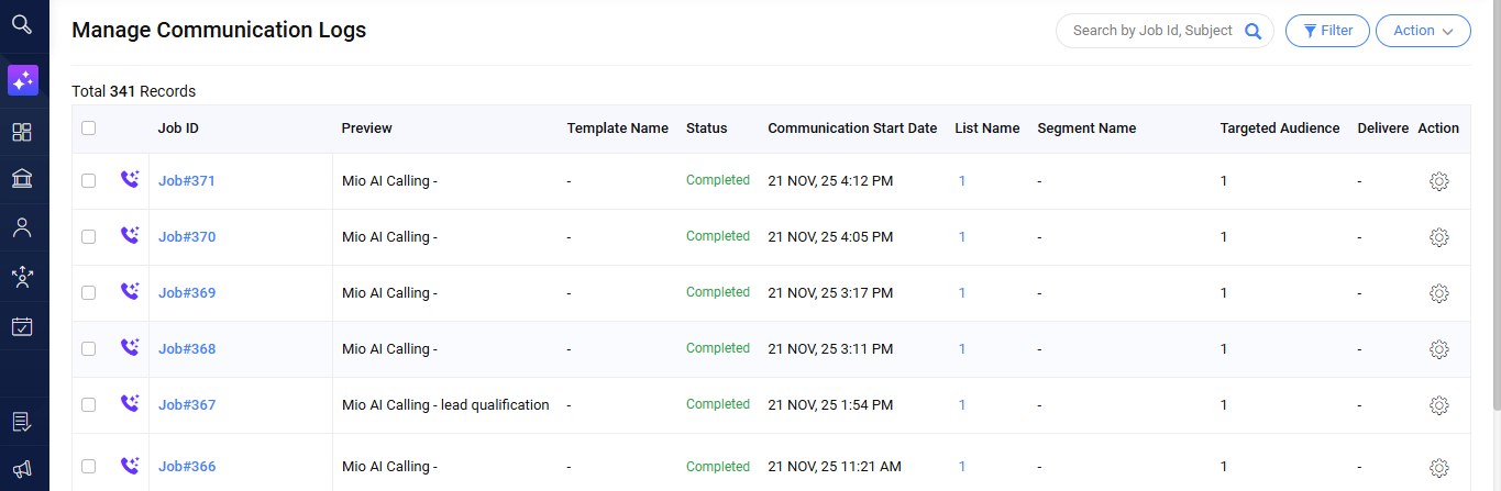 - In this, a separate Job ID for your Mio Ai Calling Campaign will be created and can be distinguished by the Calling icon next to the Job ID. You can also track the Target Audience (Number of Leads) to whom the Campaign was deployed for.