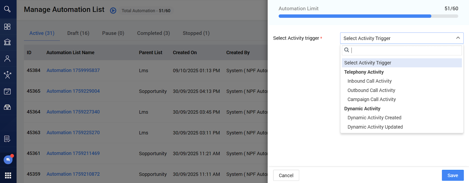 We’re excited to announce the launch of a new Activity Trigger within the automation system, now available for the Opportunity and Lead modules. This update introduces support for both Telephony Activities and Dynamic Activities, allowing automations to be triggered based on real-time call interactions or dynamic activity events.