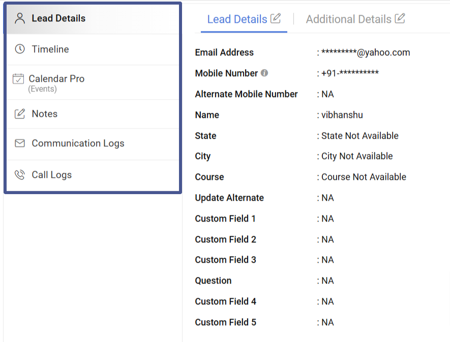 Lead Journey displays basic information about the lead such as name, contact details, and the course or program they are interested in. All the fields are editable by the assigned lead owner except email and mobile number. You can also make further tabs under lead details to show additional details for a specific lead.