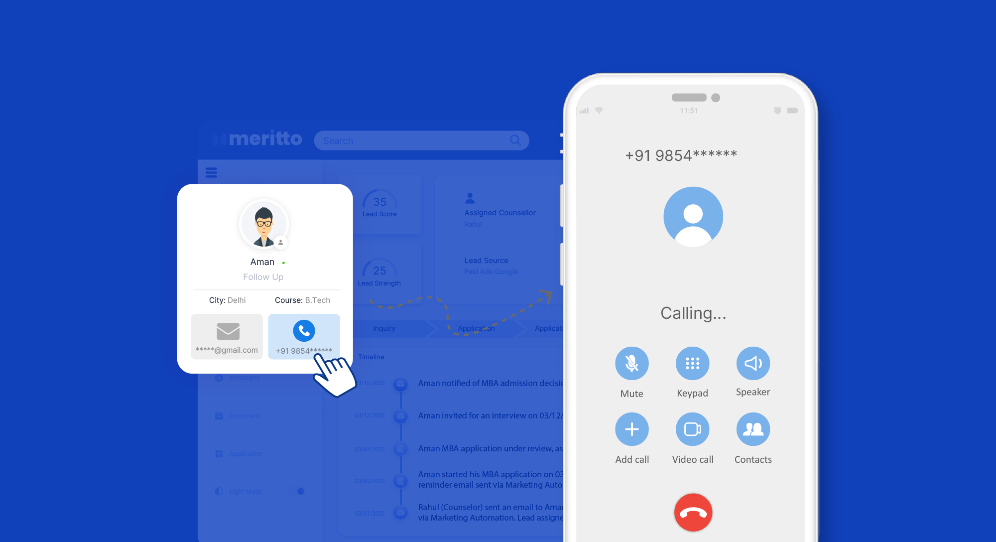 Experience intelligent calling built right into Meritto that allows users to initiate phone calls directly from the CRM without manually dialing numbers or switching between apps.