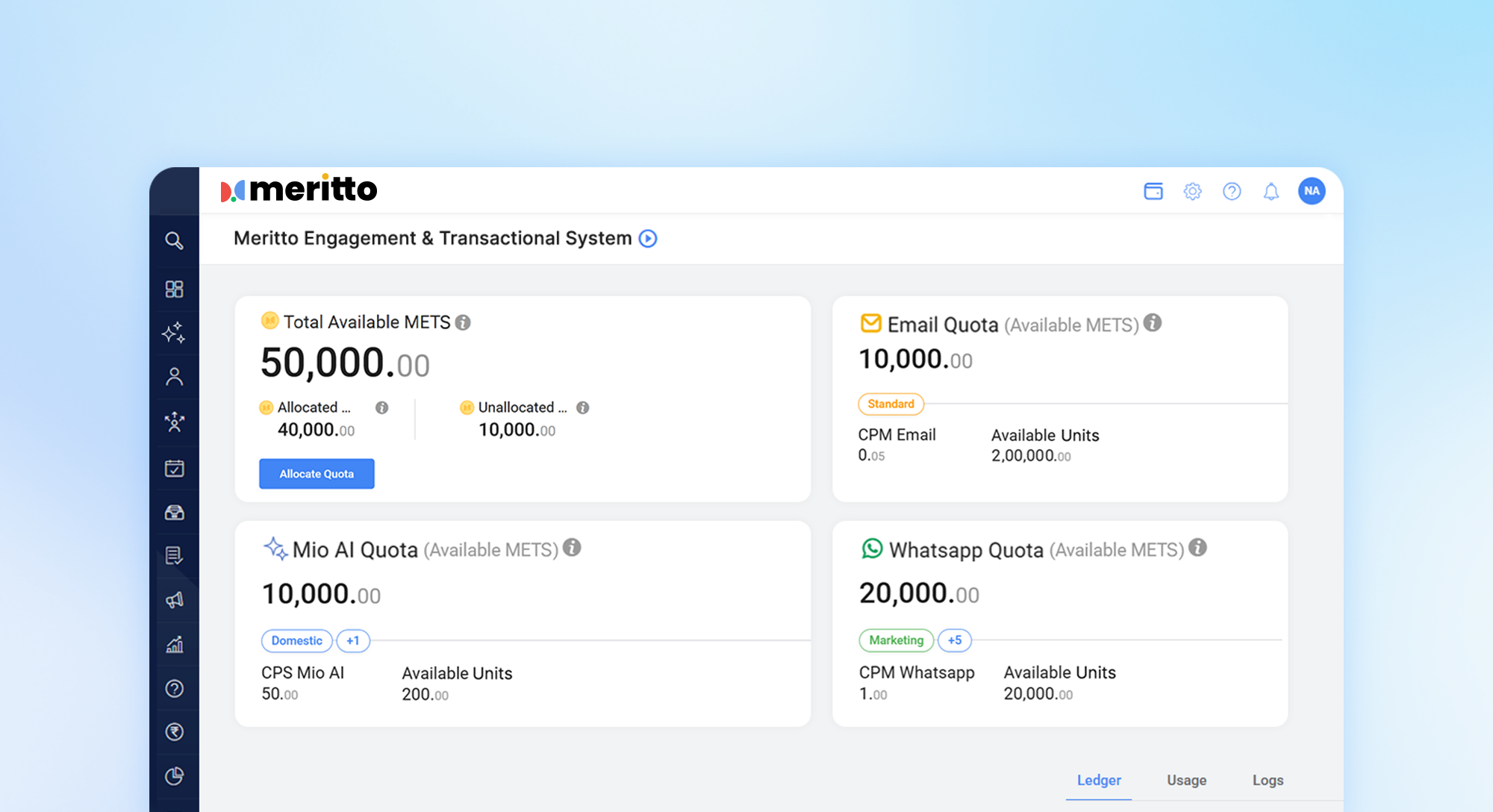 We’ve recently introduced the Meritto Engagement and Transactional System (METS). With its unified credit-based system, it powers all student engagement across all channels, like WhatsApp, Email, SMS, Broadcast, automation, and our very own Agentic AI product line, Mio AI.