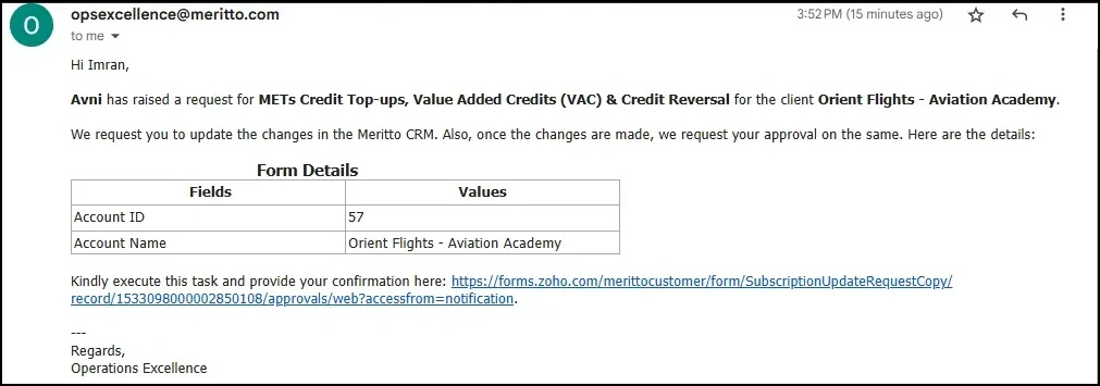 - Once it reaches the Operations Excellence Team, the relevant top-up or configuration change will be executed in Meritto CRM.