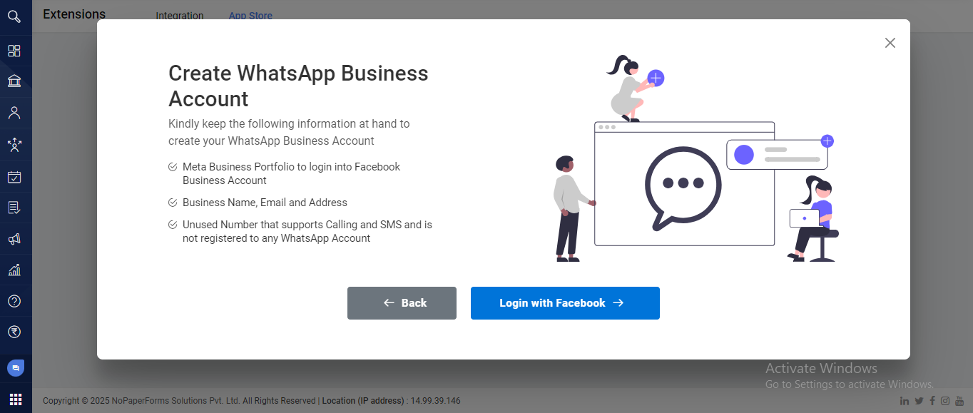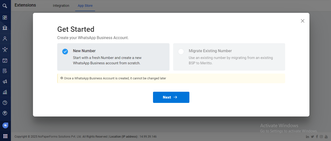 - At one time, only one vendor can be utilized and used for WABA Communication. For example, if the user is onboarded via Meta WABA App on App Store, other vendors cannot be configured simultaneously and vice versa.