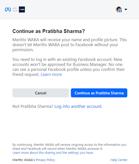 - The page will ask you to login through the Facebook account after which you will proceed to set up your WhatsApp Business Account. If you need to change the same, click on the upper right profile icon to log in via a new account.