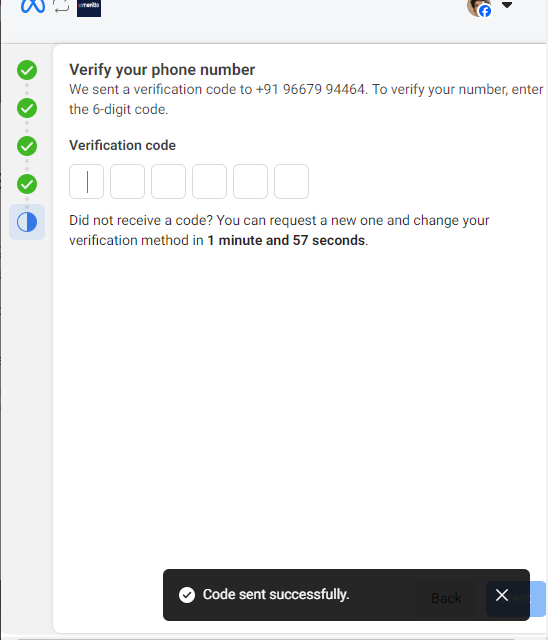 - After clicking on "Next", it will trigger a verification code or call from Meta to the phone number specified in the previous step by you. Enter the code as it is in the space provided on the page.