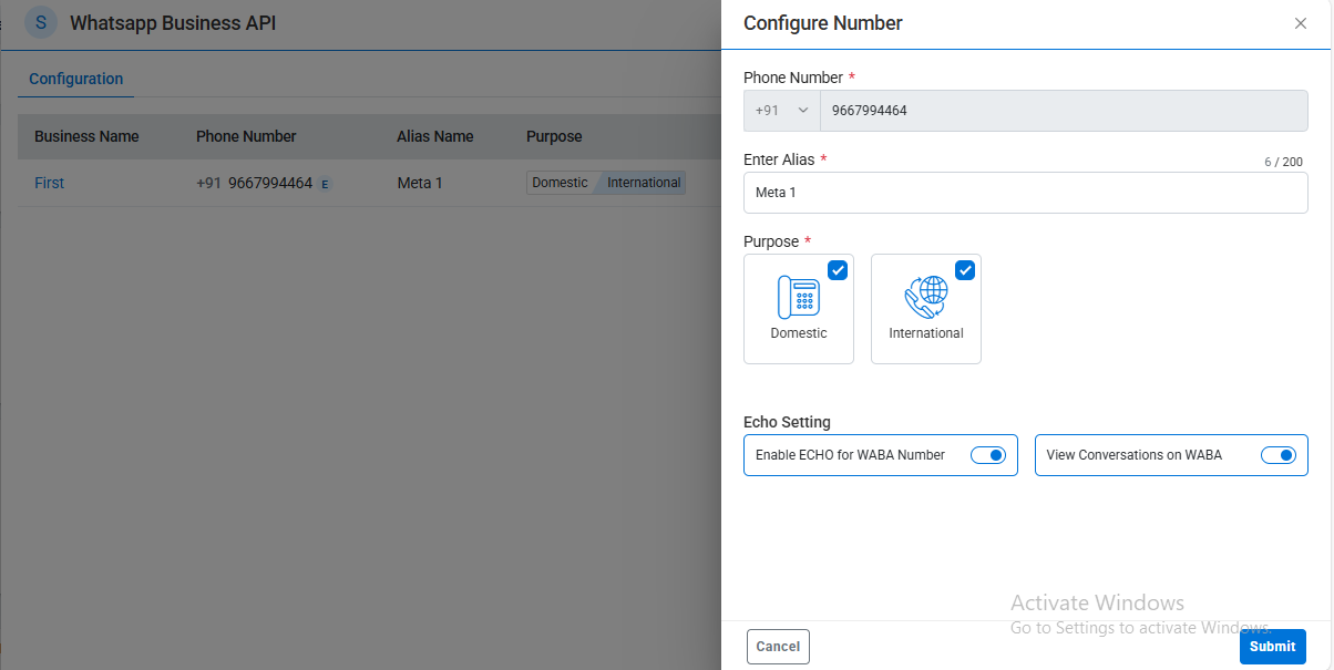 - Configure Number: This is used to set the NPF Alias, Echo enable/disable, and whether the number is to be used for Domestic or International messaging.