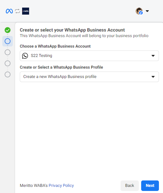 - In the next step, you will be provided with the option to configure their WhatsApp Business Account details. This screen displays existing WhatsApp Business Accounts (WABA) already created on the business portfolio selected in the previous screen. It also gives business customers the option to create a new WABA on their existing portfolio, if they haven't reached their WABA limit. If they are creating a new portfolio, they are only given the option to create a new WABA.