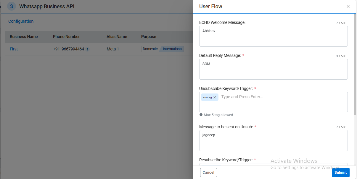 - Similarly, if in case the Echo is not configured and you want a default reply to be sent to the user who directly messages a WABA Number, then the same can be configured under "Default Reply Message".