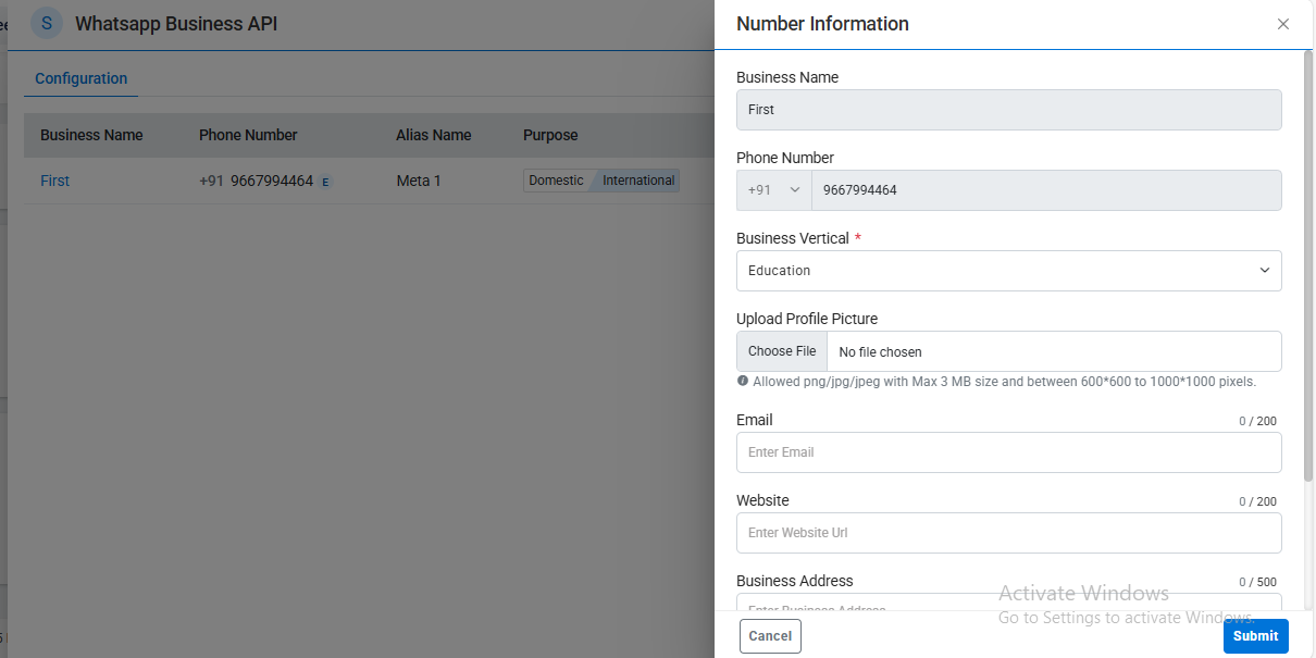 - Post filling in the details, click on the Submit button to save the details. Wait for a minute or two for the changes to get reflected in the WhatsApp App.